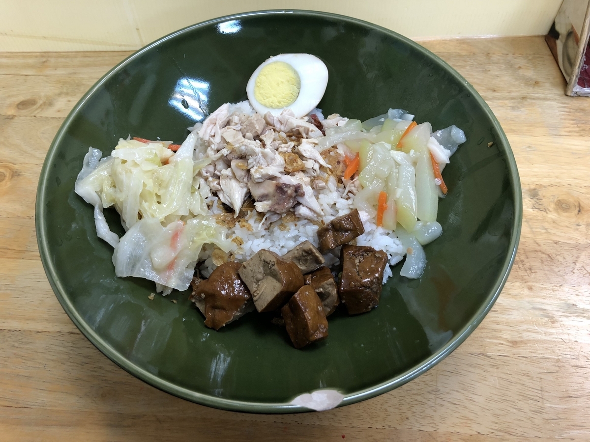 鶏肉飯はオニオンフライ的なものがかかっていて、例によって香ばしいです。鶏はすこしパサパサになってるタイプです。出汁も多めでした。おいしい。卵はもうちょっと味しみててもいいかなぁって思っちゃいました。